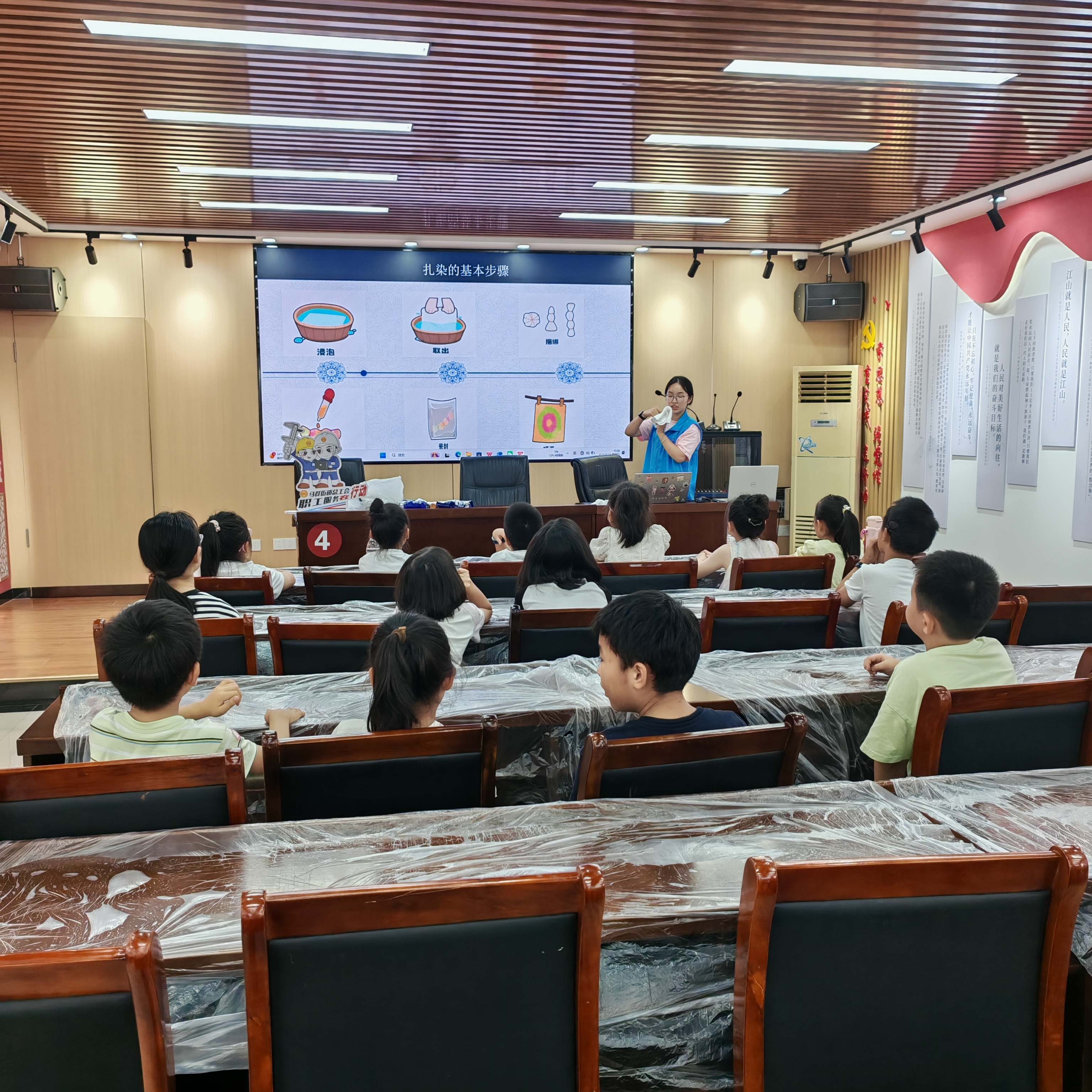 活动伊始,社区特别邀请了非遗传承老师为孩子们带来扎染小课堂。老师通过图片展示和实物讲解,向孩子们介绍了扎染的起源与发展——这项源自民间的染色技艺,凭借其“随心成型、千变万化”的特点,在历史长河中流传千年,如今更是被列入非物质文化遗产名录。孩子们听得津津有味,不时举手提问,对扎得不一样,染出来的花纹就不同充满了好奇。