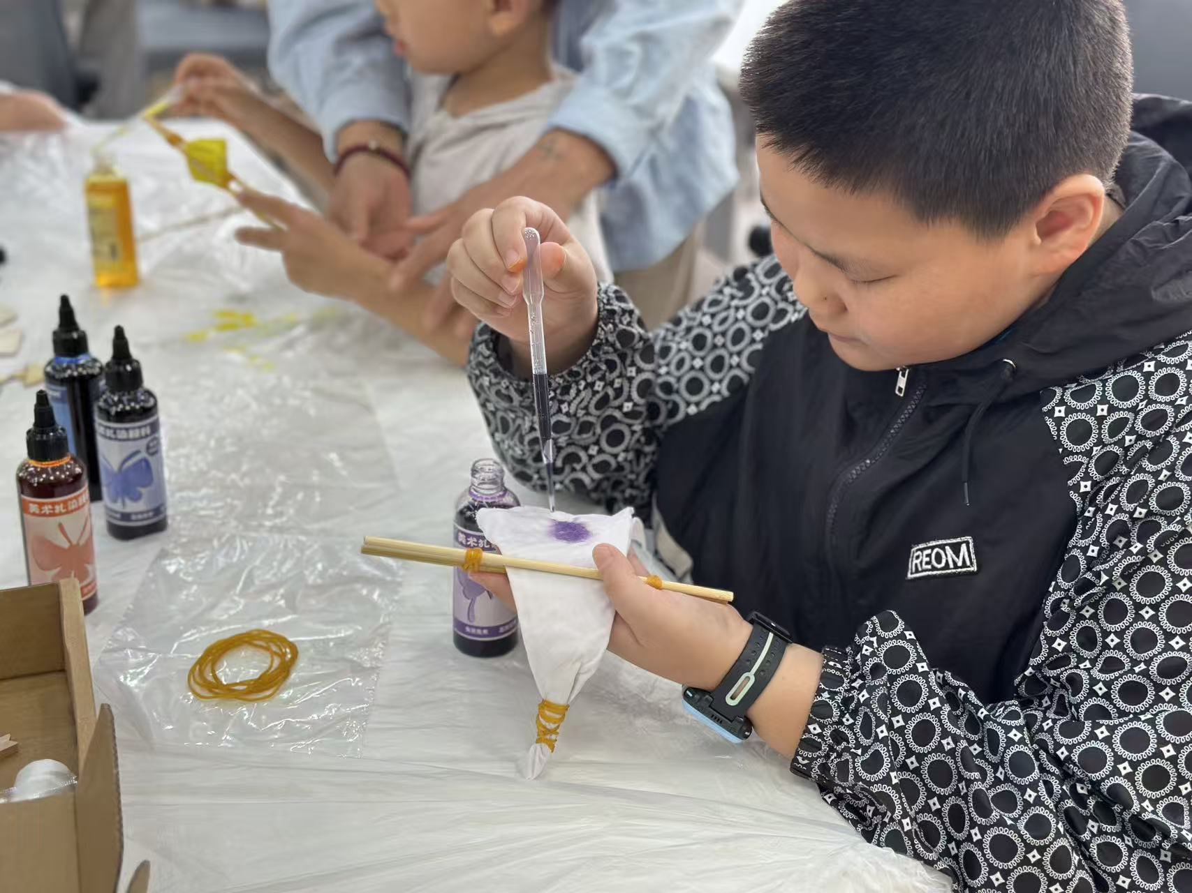 最令人期待的环节是植物扎染体验。在老师的指导下,孩子们亲手操作,利用天然植物颜料进行扎染创作。一块块白布在经过捆扎、浸染、晾晒后,呈现出独一无二的自然纹样与色彩,让大家在动手实践中感受到非遗技艺的奇妙与传统文化的深厚底蕴。