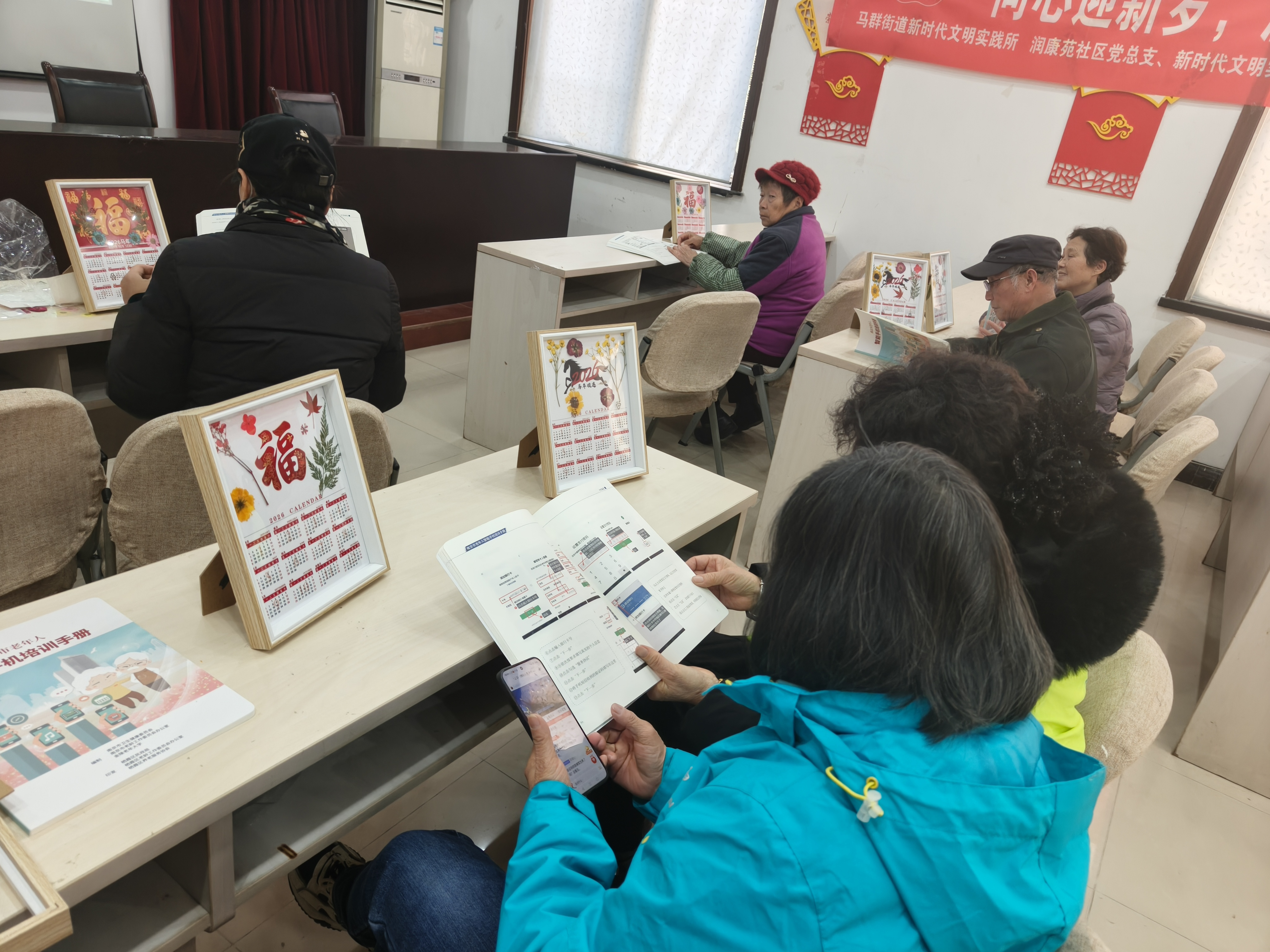 台历DIY环节同步开展,社区工作人员备好日历模板、装饰材料,老人们相互协助,将精美的装饰粘贴在日历上,一张张专属台历承载着新年祝福。