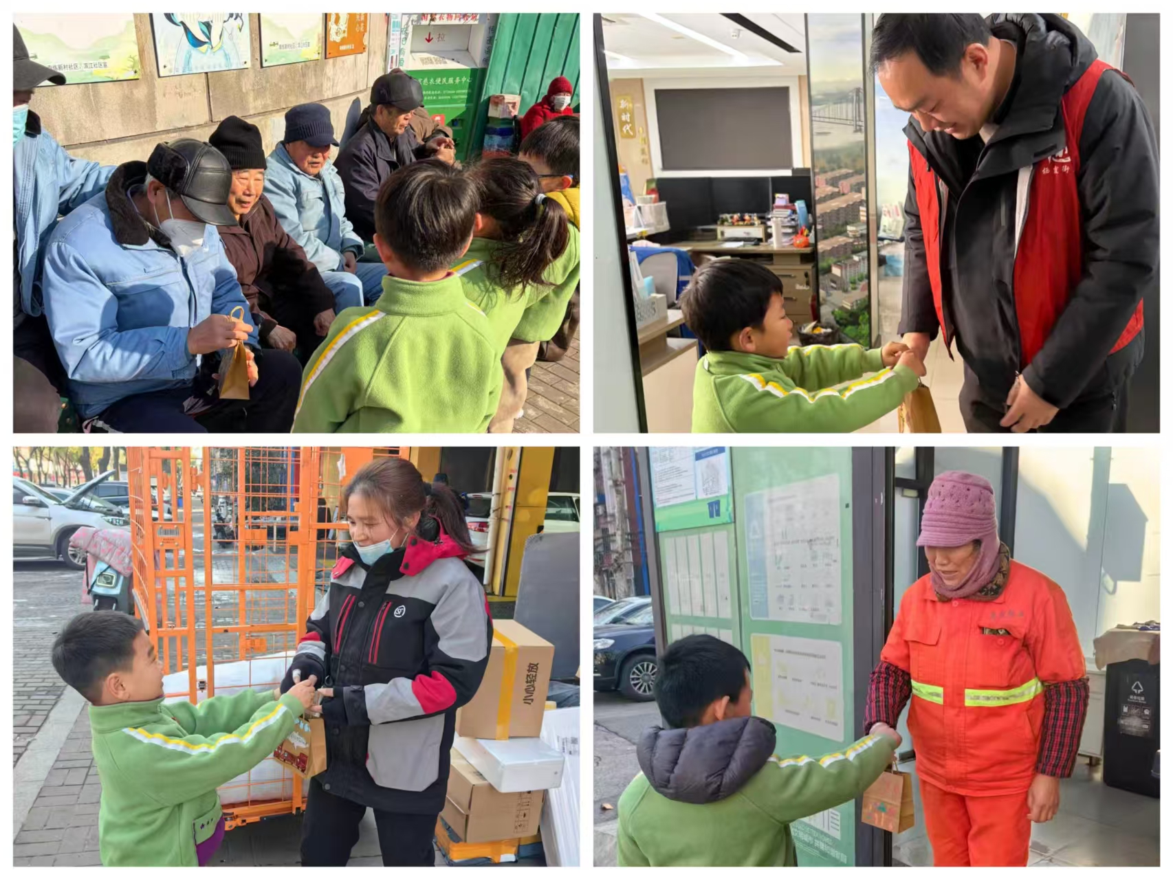 1月23日上午,冬阳和煦。樱花幼儿园的小朋友们在老师带领下,排着整齐的队伍走进小区。每个孩子手中都提着一个精心装饰的手工腊八节手袋,里面装着由师生共同搭配的腊八粥原料——红豆、红枣、莲子、花生等八样食材。社区广场上,孩子们用清脆的童声向正在社区的老人们问好,正在晒太阳的老人们接过孩子们递上的礼物袋,脸上绽放出慈祥的笑容。社区主干道上,环卫工人李大姐刚刚结束清扫工作,几个小朋友就围了上来。“阿姨辛苦了,祝您节日快乐!”李大姐接过礼物袋,连声道谢。社区网格员小魏刚从居民楼巡查回来,就在党群服务中心门口遇到了送温暖的小队伍。“叔叔阿姨们辛苦了!”孩子们齐声说道。小魏感慨:“平时是我们为居民服务,今天收到这份特别的礼物,心里觉得太温暖了。”